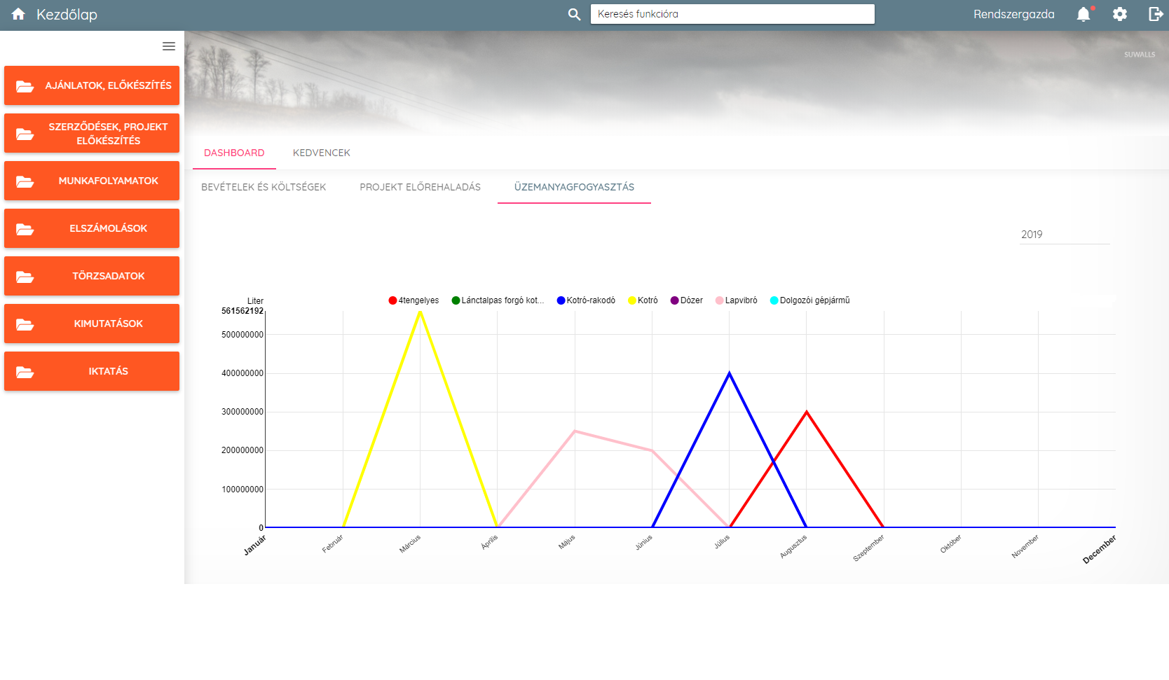 A diagramos megjelenítés mutatja a költséglapokat, előrehaladási riportokat és az üzemanyag fogyasztásra vonatkozó információkat.